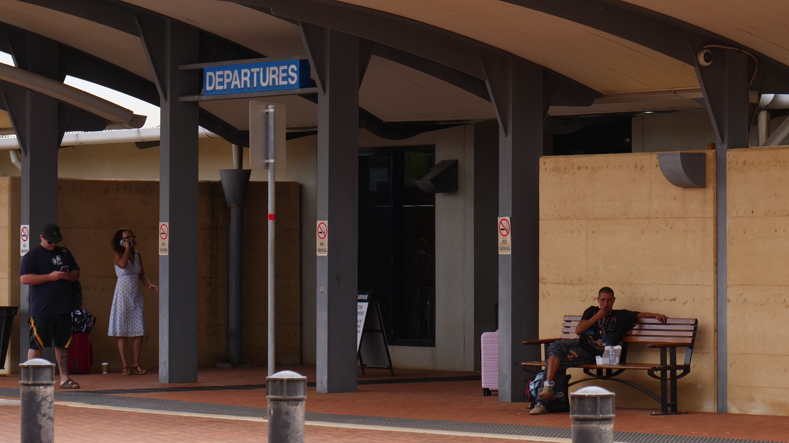 Los pasajeros esperan afuera de la sala de salidas del aeropuerto de Geraldton. (ABC Midwest & Wheatbelt: Chloe Henville)